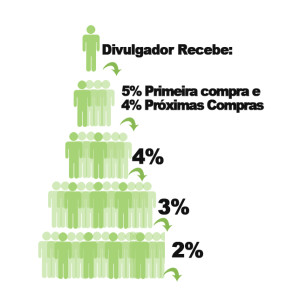Pare pra pensar nisso acontecendo com dezenas e dezenas de pessoas, indicadas por você ou pelos seus indicados… Imaginemos que você tenha 50 compradores em casa nível, e cada comprador faça uma compra por mês no valor médio de 100 dólares, o divulgador irá receber 700 dólares por mês, sendo 250 dólares referente ao nível 1 considerando 5% da primeira compra, 200 dólares referente ao nível 2, 150 dólares nível 3 e 100 dólares nível 4.